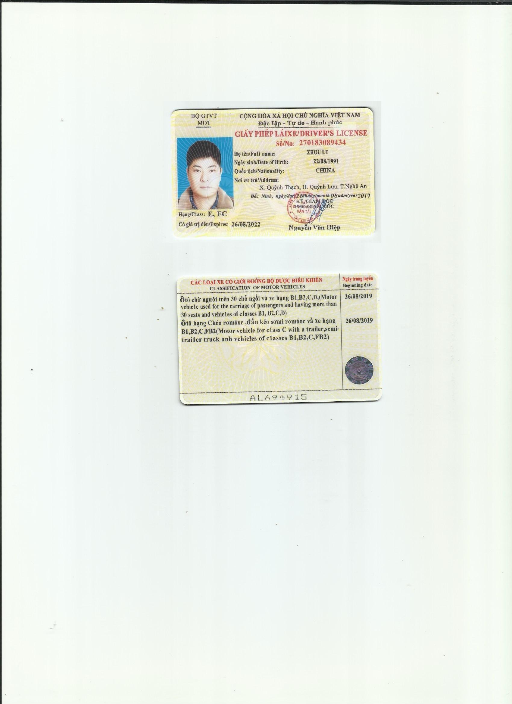 咸陽駕照翻譯 車管所認(rèn)可 咸陽證件翻譯 咸陽出入境資料翻譯 越南駕照翻譯模版